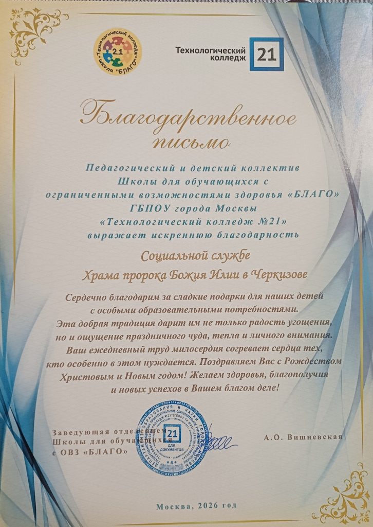 Кроме того, волонтеры храма пророка Илии в Черкизове 16 января 2025 года посетили маленьких друзей – воспитанников школы-интерната «Благо». С приветственным словом к ребятам и учителям обратился священник священник Андрей Силин. В завершение встречи маленькими артистами из студии «Зазеркалье» был представлен спектакль, после которого всем были вручены сладкие подарки.
