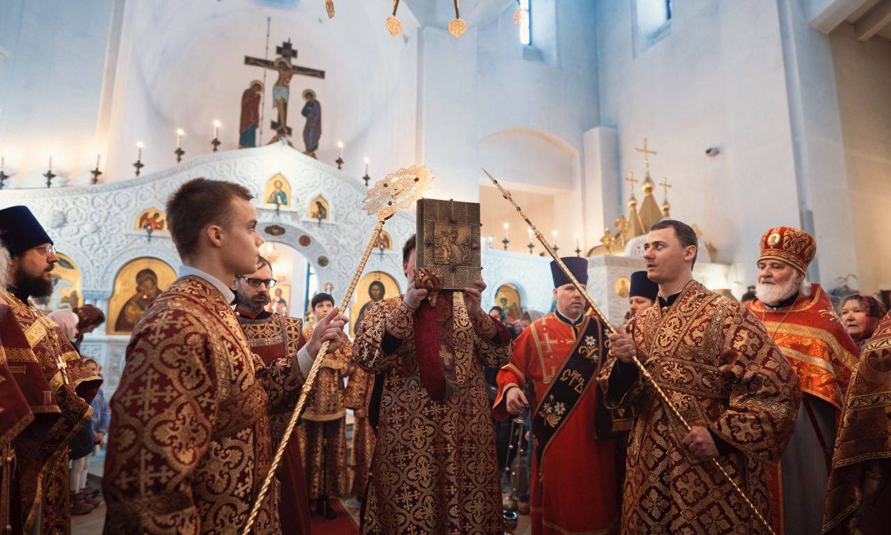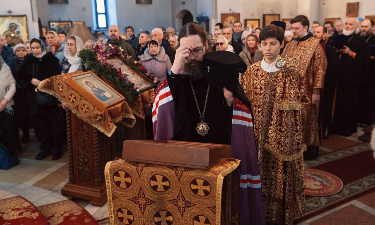 «Ваше Высокопреподобие, дорогой отец Андрей, настоятель сего храма протоиерей Георгий, дорогие отцы братья и сестры, всех вас поздравляю с престольным праздником, с именинами храма! Благодарю всех отцов за сослужение, мирян за совместную молитву и за единое служение Святой Евхаристии, хор за благолепное пение.