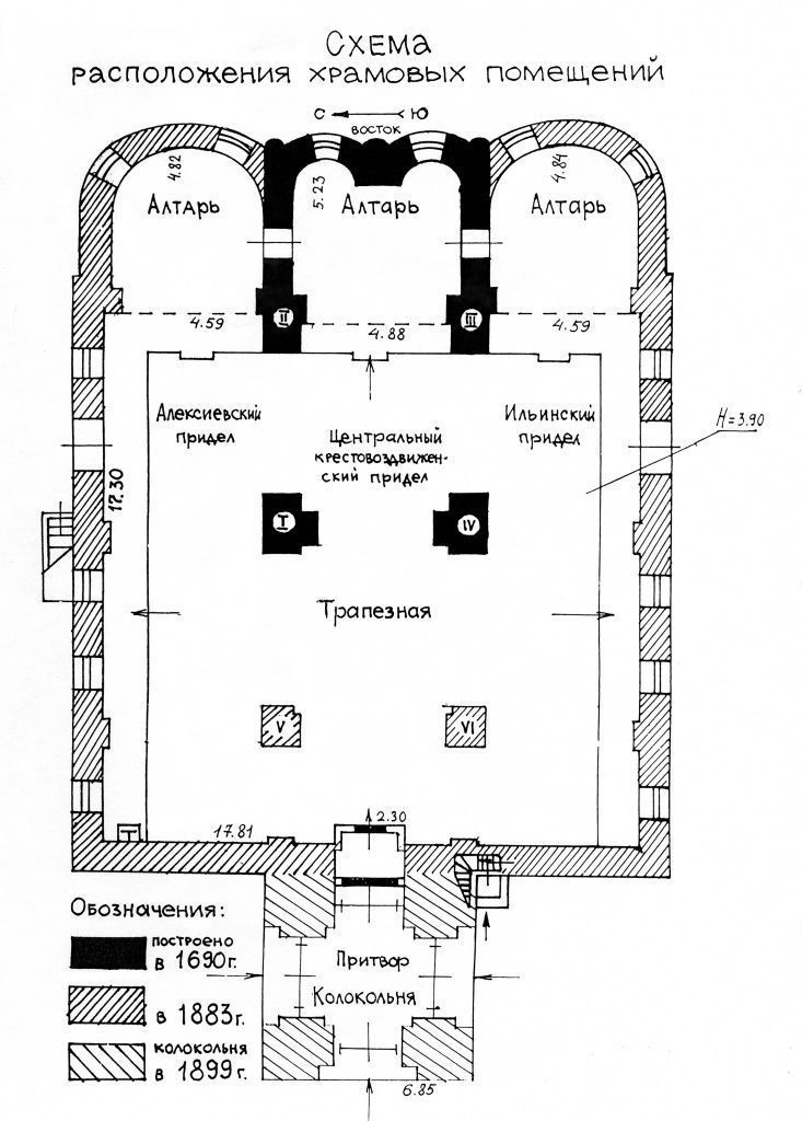 К первоначальной постройке, как следует из акта осмотра, относятся четыре стены квадрата церкви. А вот так называемого искажения коснулась ее северная сторона. «Эта церковь по времени своей постройки относится к XVI веку и уцелевшие до наших времен остатки ея должны быть охранены от дальнейших искажений, – писали архитекторы, полагая, что в конце XVII века к древней церкви был пристроен придел с северной стороны и трапезная во всю ширину этого придела и древней церкви. В это же время был перестроен алтарь в теперешний троечастный, – причем два полукружия составили алтарь древней церкви, а одно, северное – алтарь придела. На горнем месте главного алтаря, в простенке между двумя полукружиями, устроена впадина для епископского седалища».