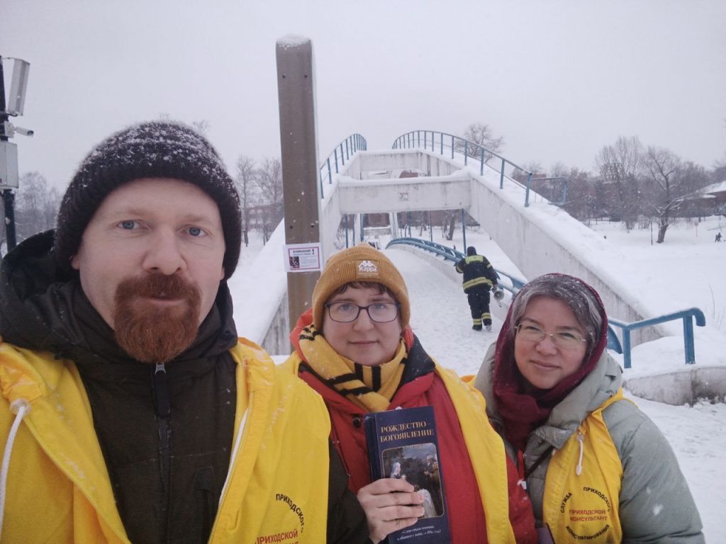 Сотрудники службы приходского консультирования храма пророка Илии в Черкизове вышли с благовестием о Рожденном Спасителе на набережную Черкизовского пруда в самый день праздника Рождества Христова, 7 января 2026 года.