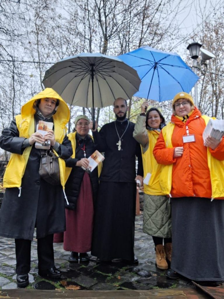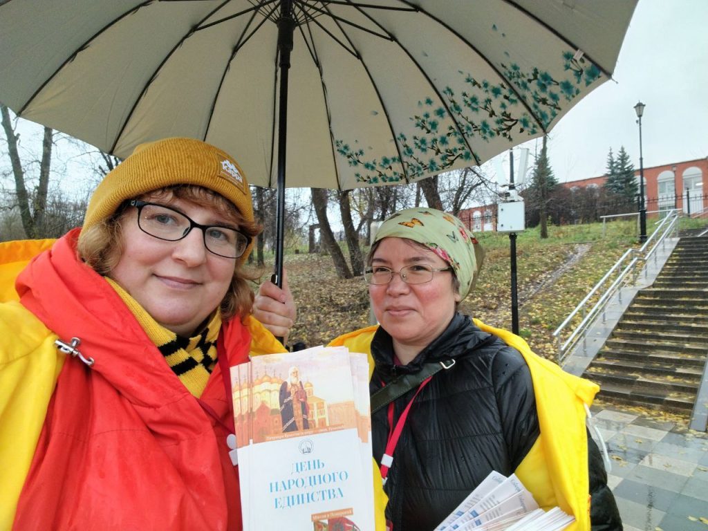 Раздавались буклеты, подготовленные Синодальным миссионерским отделом о Дне народного единства. Несмотря на неблагоприятные условия — проливной дождь и малочисленность прохожих, пожелавших в такую погоду выйти из дома, консультанты раздали около четырехсот листовок.