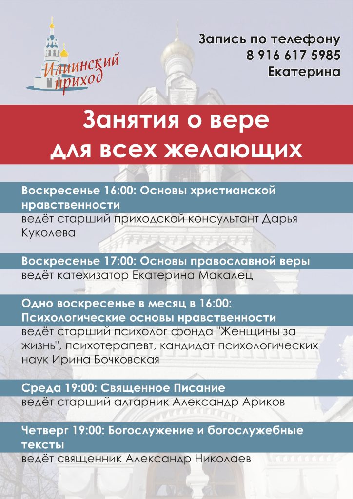 Начинается работа многолетнего проекта храма пророка Илии в Черкизове, благодаря которому можно узнать об основах православного вероучения и получить знания в области литургики, Священного Писания, нравственного богословия. В этом году занятия будут проводиться по воскресным дням с 16.00 до 20.00.